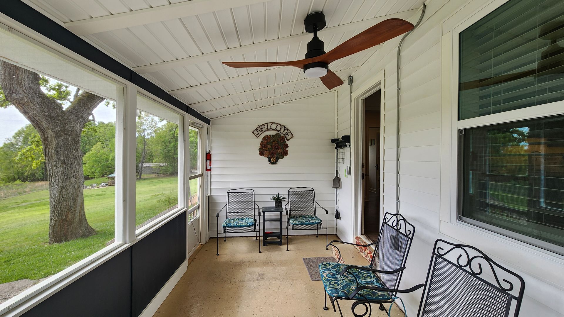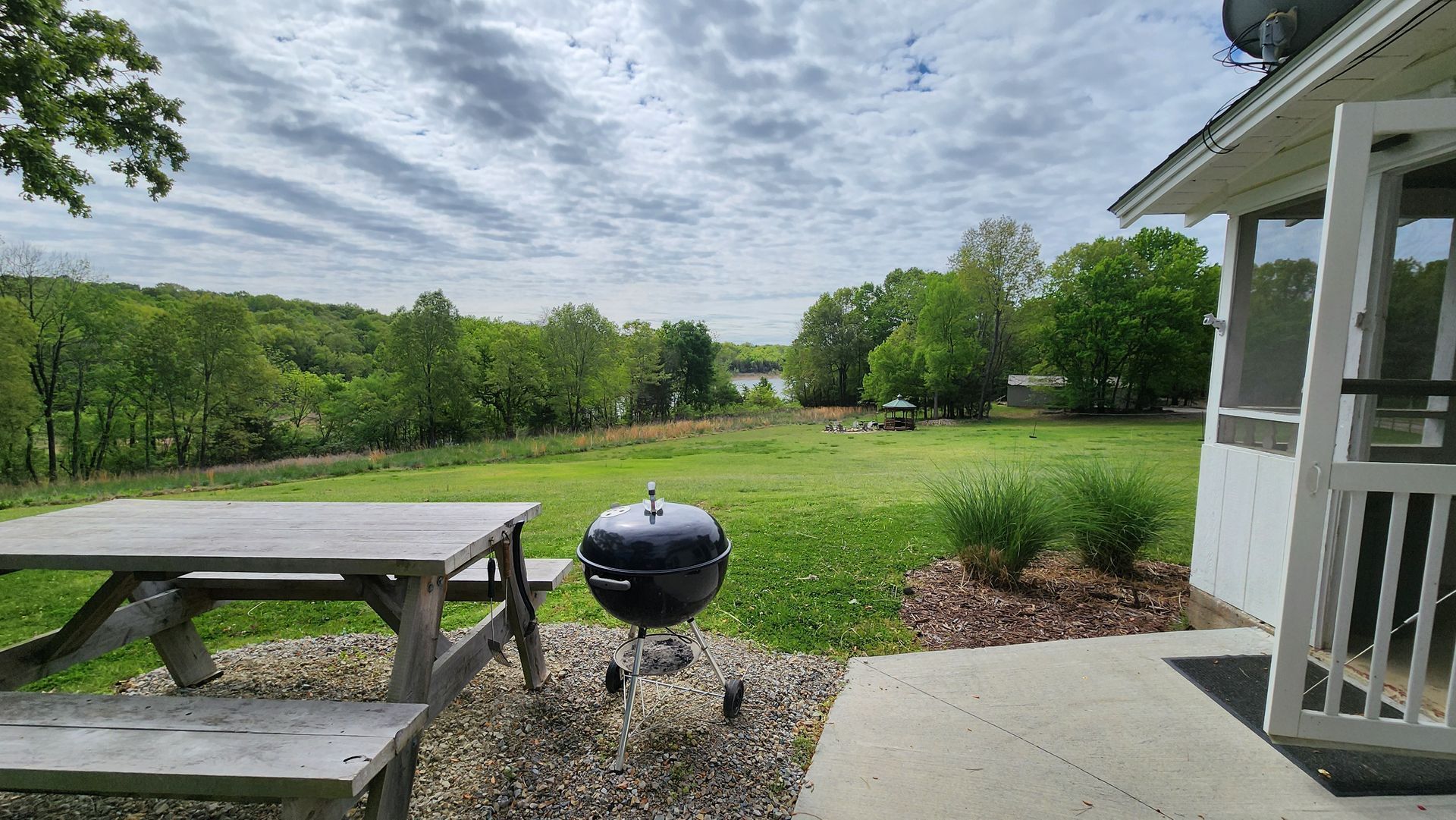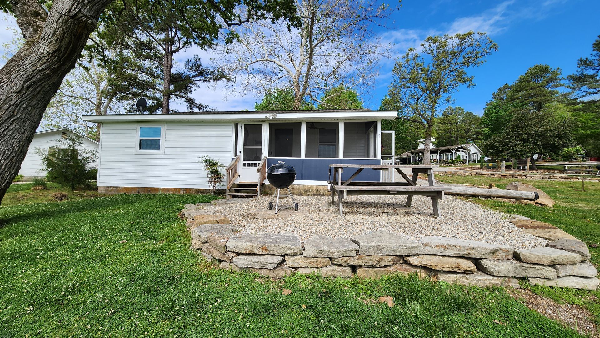 A large oak tree shades the screened porch and the outside picnic area. The view of the field in front of the cabin and calm blue waters of the cove offers a serene escape from the city life.