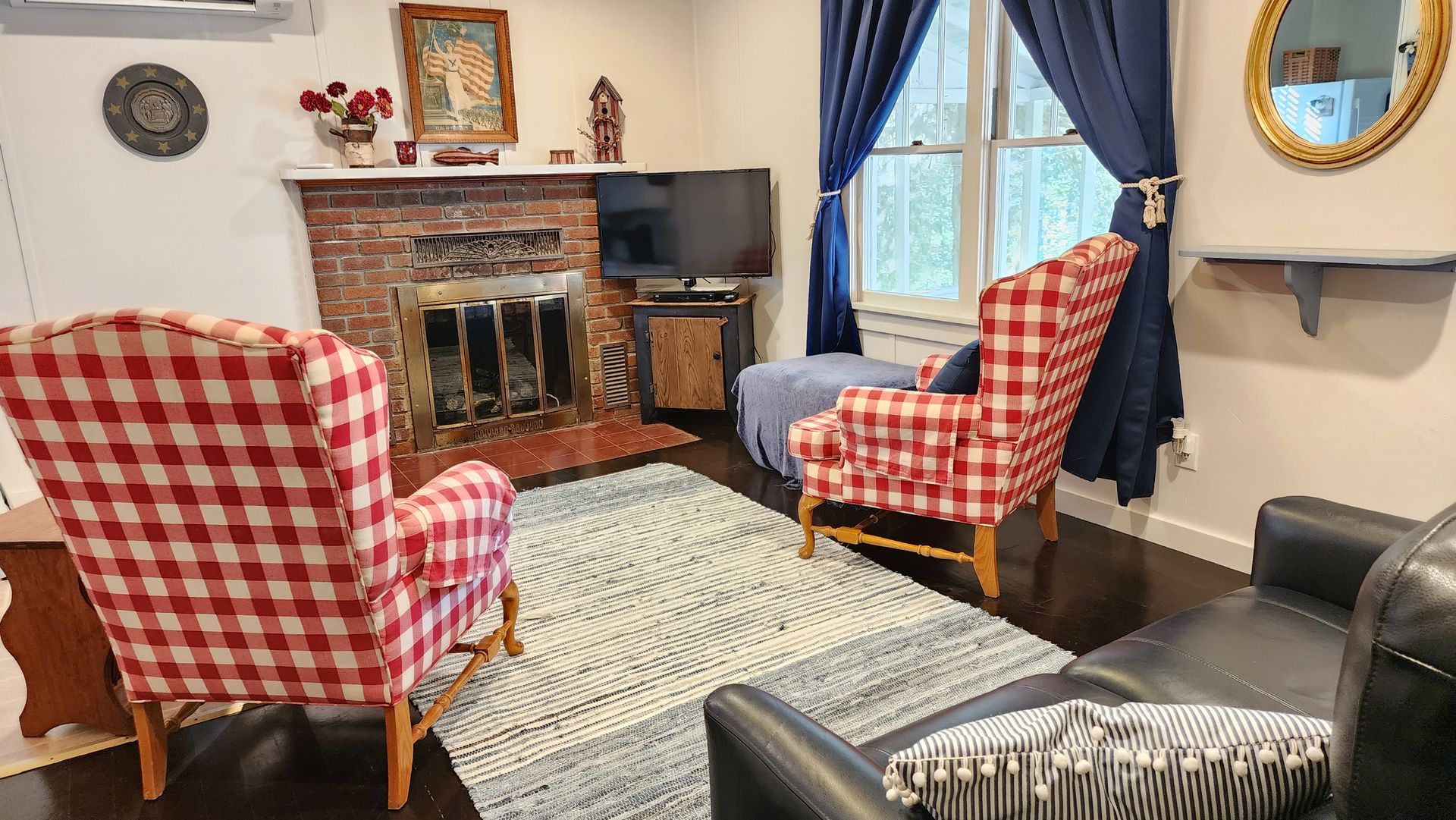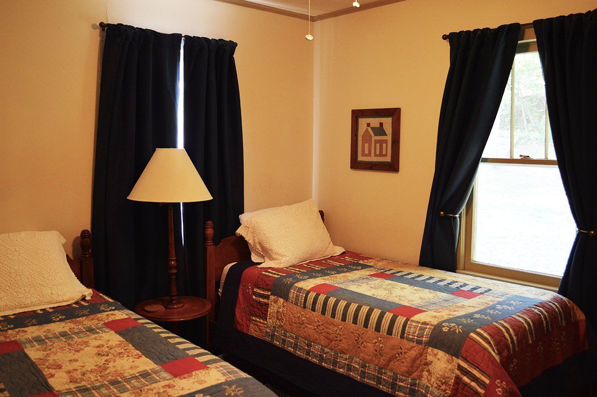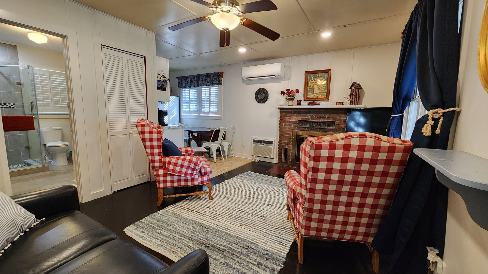 Cottage #6, with a patriotic décor, is a quaint two bedroom cottage nestled next to the woods bordering the cove. The large shaded screened porch is a great place to view all the flora and fauna of the area or take a nap on a hot summer’s day after fun on the lake. The porch has rocking chairs, a comfortable day bed, and a table and chairs.