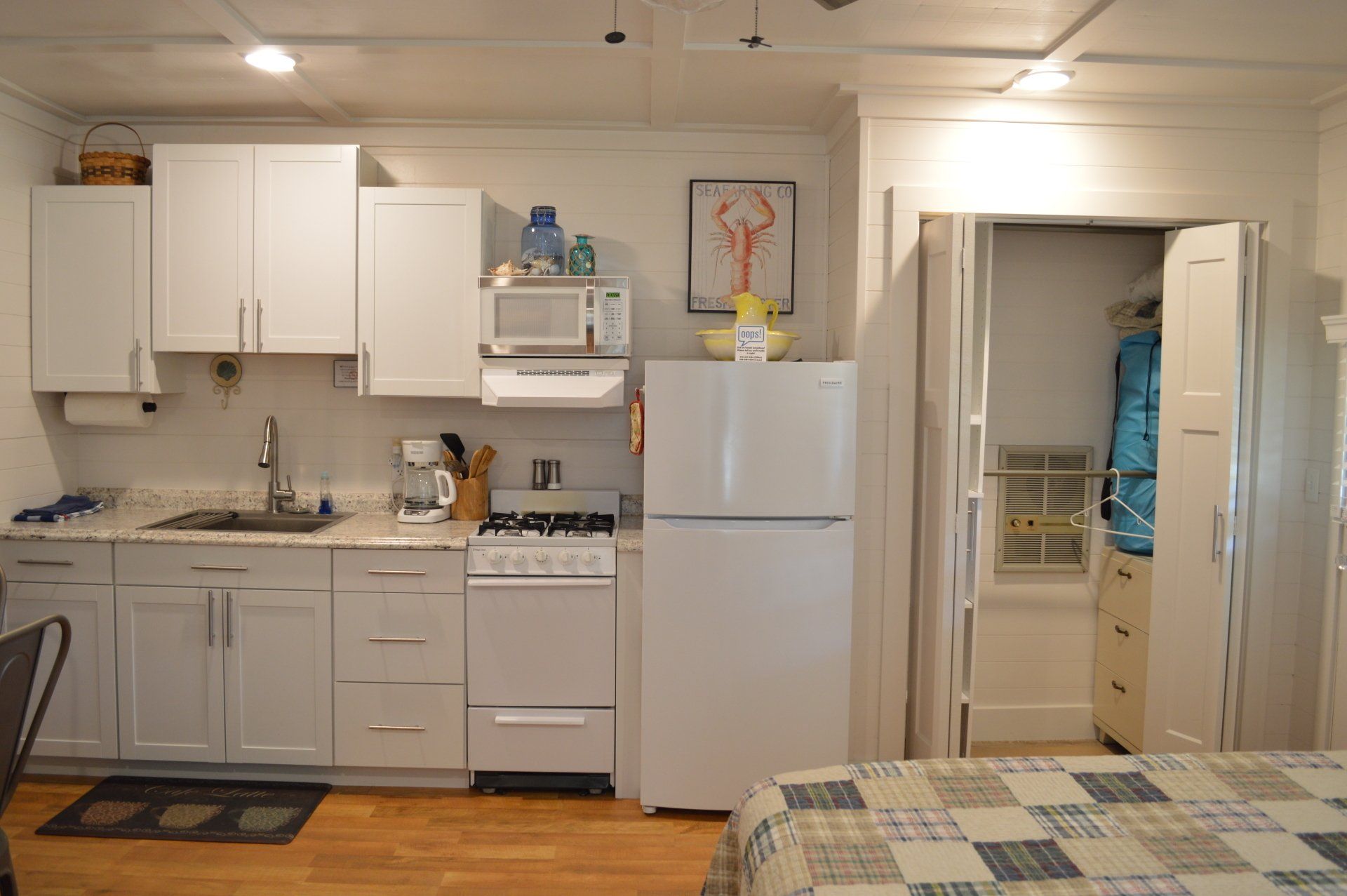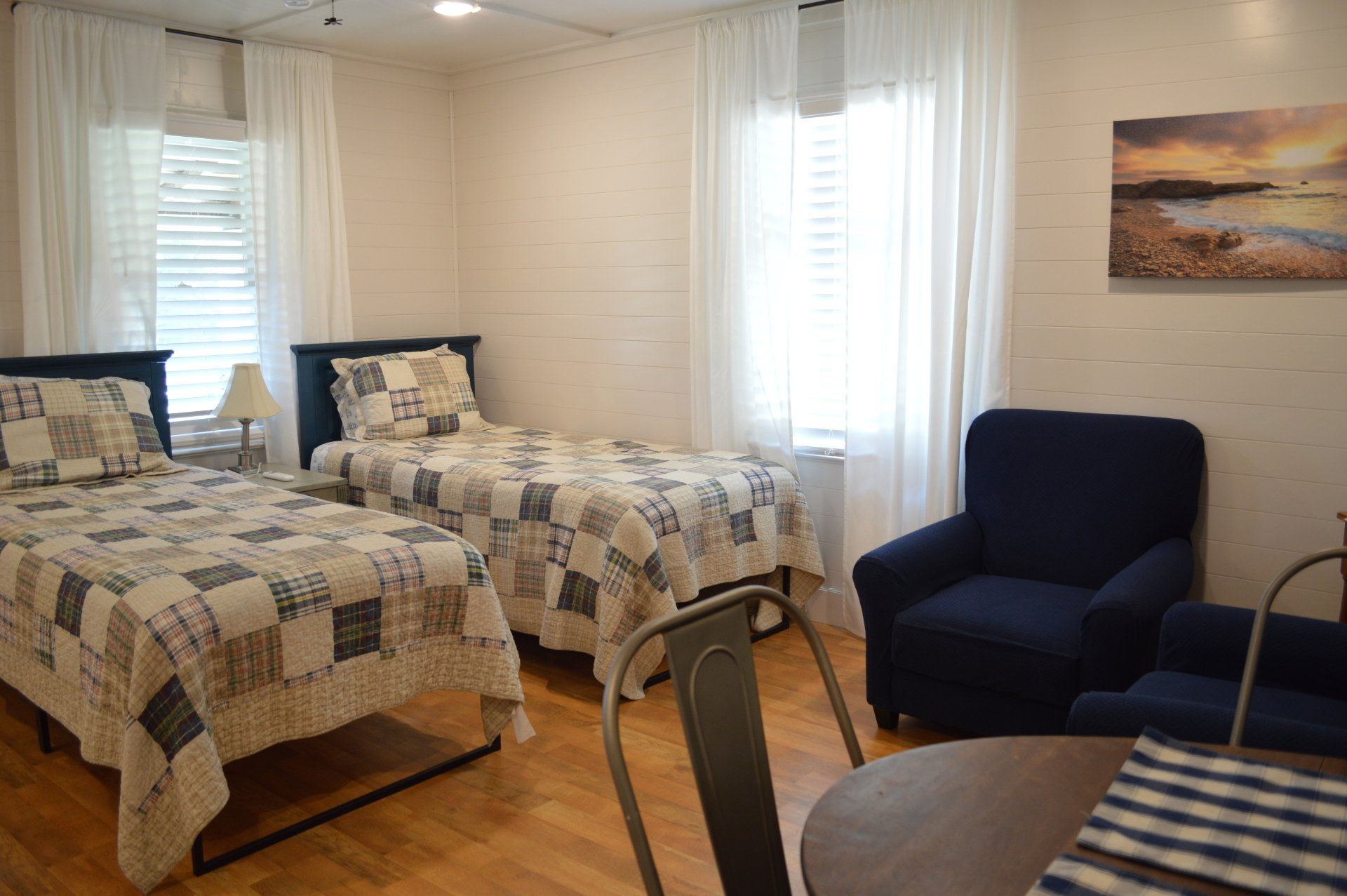 Cottages # 3 and # 4 are two separate units under one roof (duplex). Each unit consists of one large area with a fully remodeled and equipped kitchen and bathroom. Cottage 3 has a queen bed, and Cottage #4 has two XL twins. Twin pullout or mattress is available upon request.